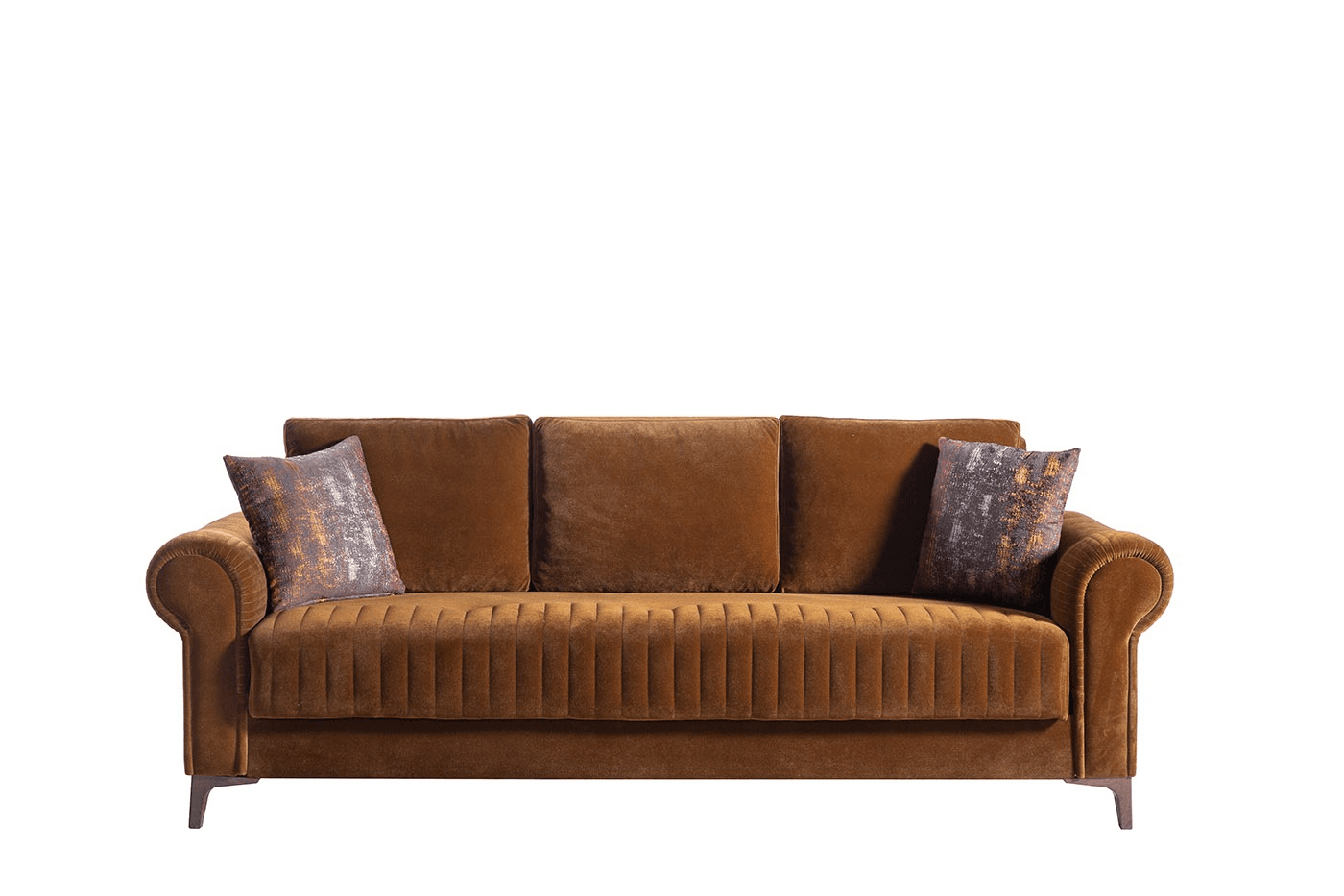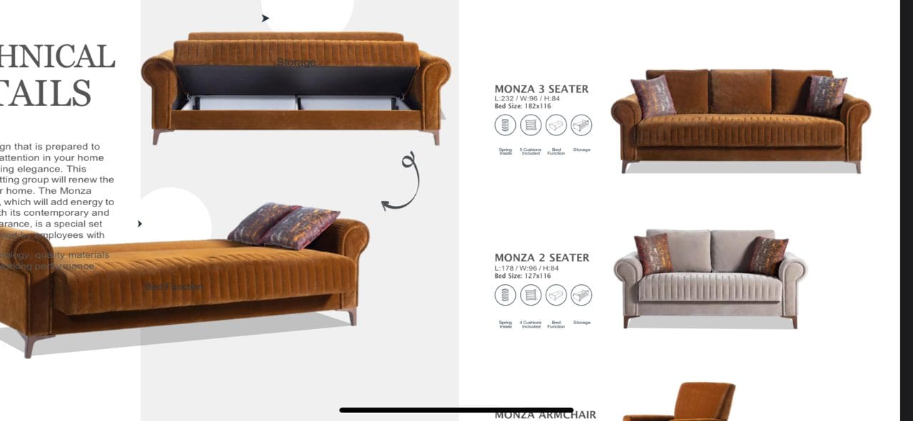 Le canapé-lit Monza est doté d’un rembourrage à ressorts assurant un soutien orthopédique. Sa structure associe bois de sapin, MDF et métal, garantissant robustesse et durabilité. Son dossier et son assise rembourrés de mousse sont revêtus d’un tissu en polyester doux.