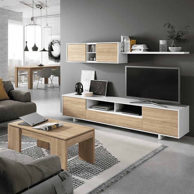 Succombez au look moderne de l’ensemble meuble TV blanc et chêne Belus. Son look minimaliste et épuré se mariera parfaitement avec votre intérieur et vous permettra de composer selon vos désirs le salon-séjour de vos rêves. Le jeu de couleurs blanc brillant et noir brillant vous offrira un raffinement et une élégance indéniable. Avec ce combiné de meubles suspendus et son meuble bas, vous bénéficierez d’une capacité de rangement incroyable pour une sensation d’encombrement moindre.