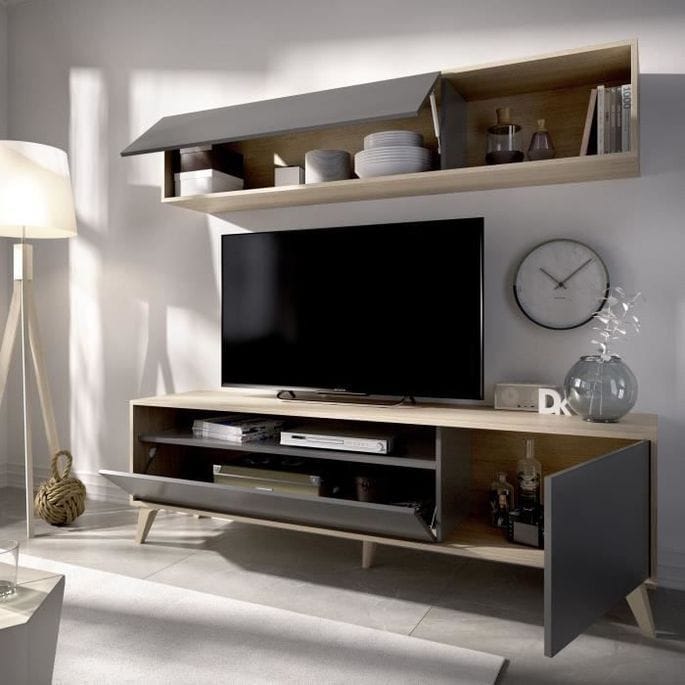 Habillez votre intérieur, avec ce meuble TV moderne Celia ! Spacieux et tendance, ce meuble au style Scandinave est très pratique, grâce à ses nombreux rangements en haut et en bas, fermés ou pas, à convenance, et égayera votre intérieur avec ses touches de graphite.