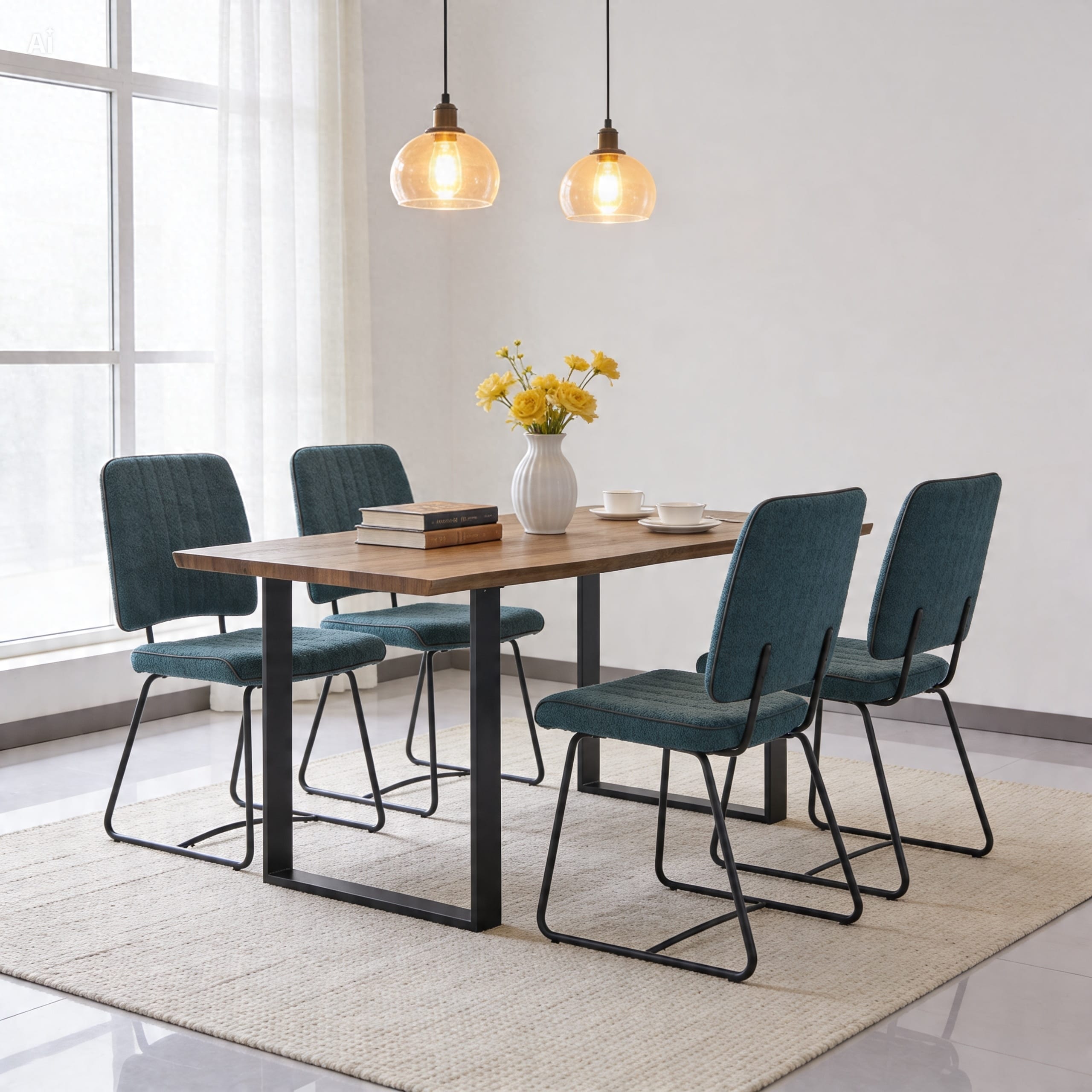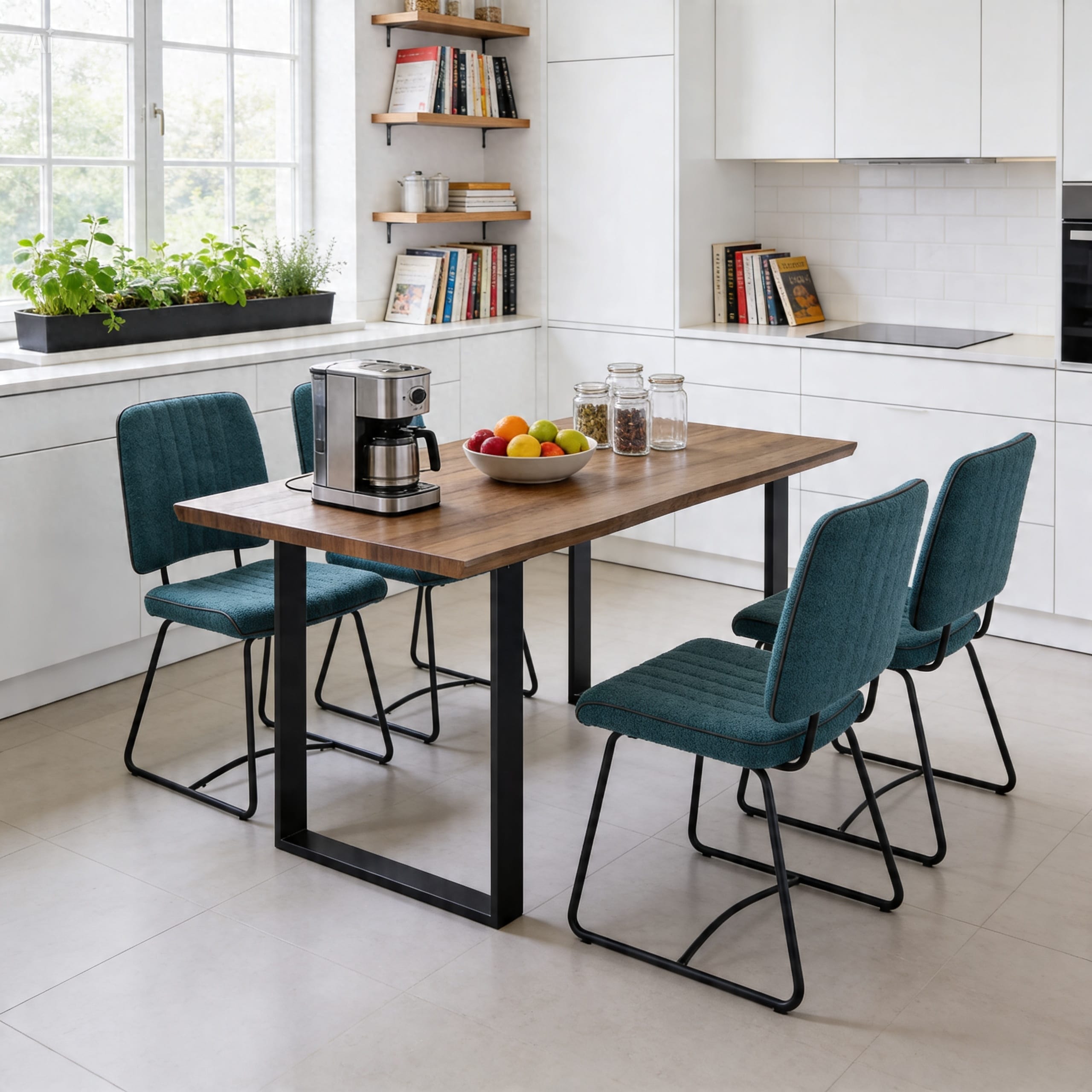 DESTIN table à manger L150 cm + 4 JUDE Chaise en tissu bleu